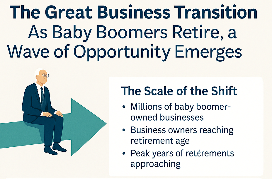 The wave of baby-boomer business exits marks one of the most pivotal transitions in small-business history. While not overwhelming in volume just yet, the groundwork is in place for a major generational shift—one brimming with strategic opportunity. Sellers have the chance to retire with purpose, preserve what they built, and ensure community continuity. Buyers have the chance to step into existing success stories—and transform them with modern vision.